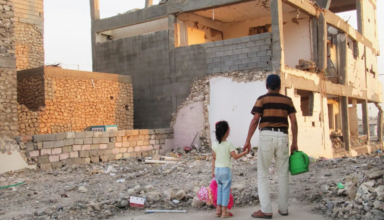 日内瓦/拉马迪(红十字国际委员会/佳能)——照片:废墟中锈迹斑斑的汽车。垮塌的桥梁。破烂的伊拉克国旗。一个抿嘴微笑的小妹妹。