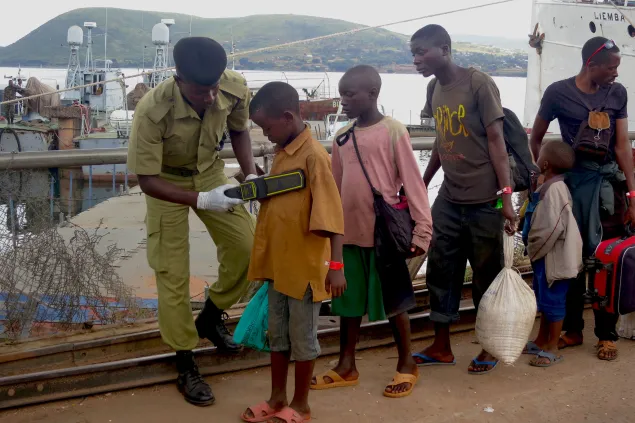 一名安检员正在对从卡贡加过来的难民进行安全检查。安全检查是强制性的,旨在保障难民和基戈马居民的生命安全。