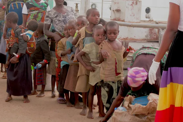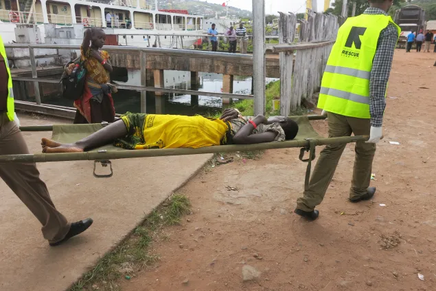 来自卡贡加的难民有些人非常虚弱,医务人员与救护车随时待命,确保他们能安全抵达坦噶尼喀湖体育馆,在那里他们的伤病就可以得到治疗。