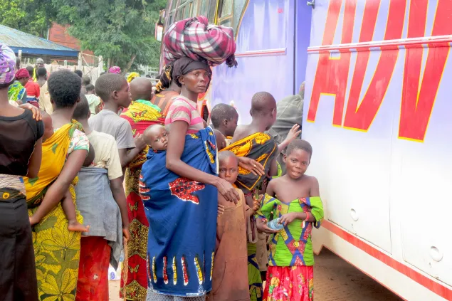 妇女和儿童坐上联合国难民署提供的几辆巴士,这些巴士会将他们从基戈马送到坦噶尼喀湖体育馆。