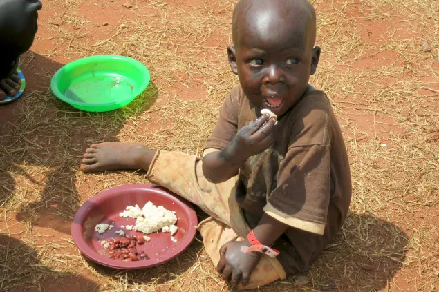 一个孩子从头天晚上离开卡贡加到抵达坦噶尼喀湖体育馆,终于吃上了第一顿饭。该体育场是所有难民前往尼亚如古苏难民营之前必经的中转站。