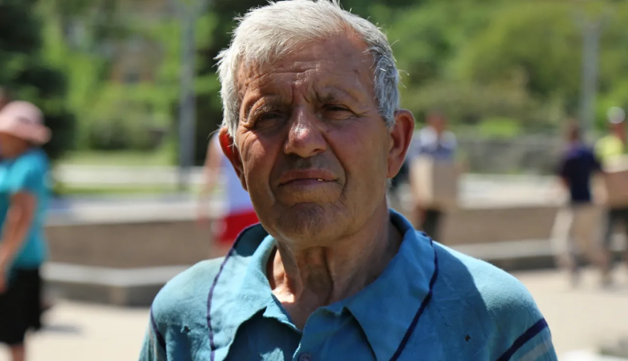 观看志愿者卸下人道物资的人群中有一位77岁的老者伊万·特罗菲莫维奇。他是来支持年轻人的。他也想讲述自己的故事。