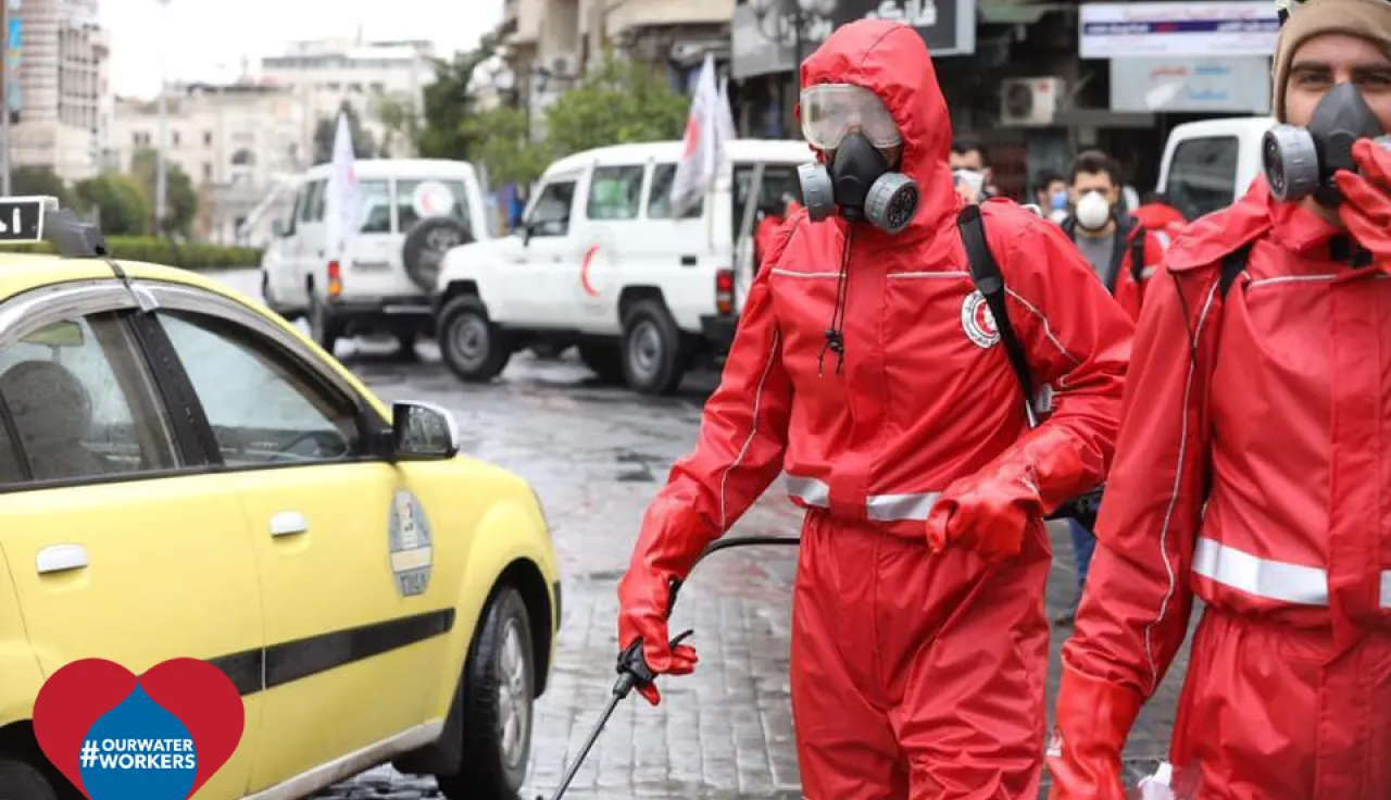 为了支持大马士革和大马士革农村省水务局的工作,叙利亚红新月会的志愿者正在使用红十字国际委员会提供的设备对公共设施、建筑物和公共区域进行消毒。志愿者还在人口稠密地区和国内流离失所者中心等易受影响的地点宣传个人卫生和公共卫生相关信息。